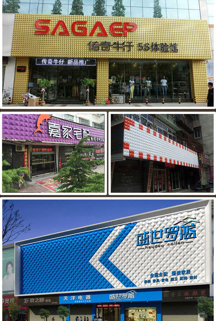 招牌材料:三維扣板,是一種使用工程塑料以及ACM強化樹脂為主要原材料來進行的制作,原材料質(zhì)地堅硬,具有很好的穩(wěn)定性能,使用它們制作出來的額三維扣板具有很好的三維立體效果,三維扣板的外觀造型簡約,且有很好的上色效果,是一種比較新型的裝飾材料,它可以廣泛使用到室內(nèi)室外的裝飾當(dāng)中。